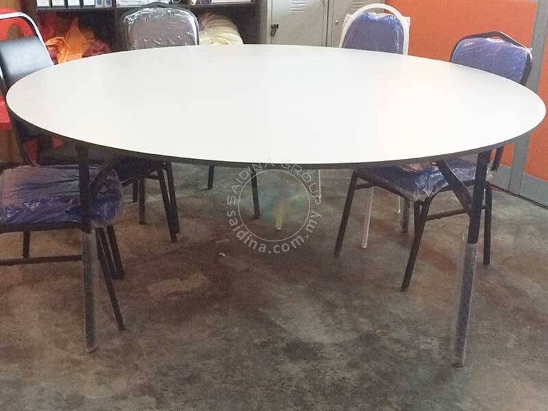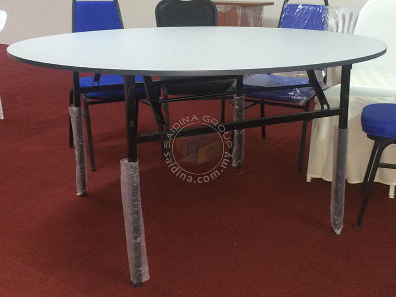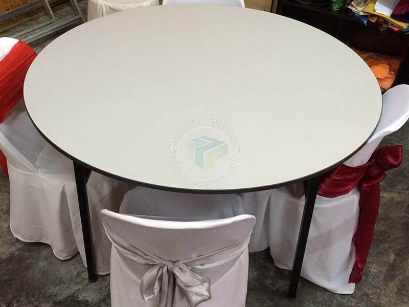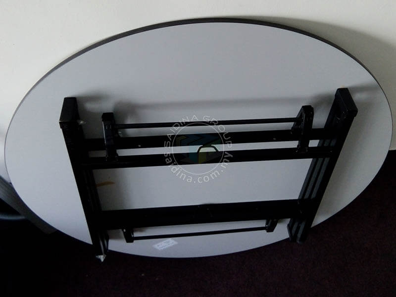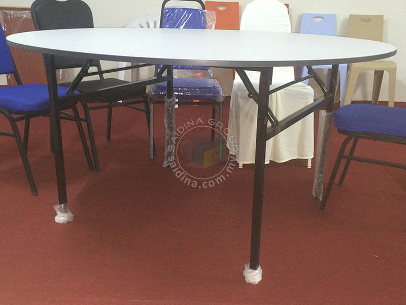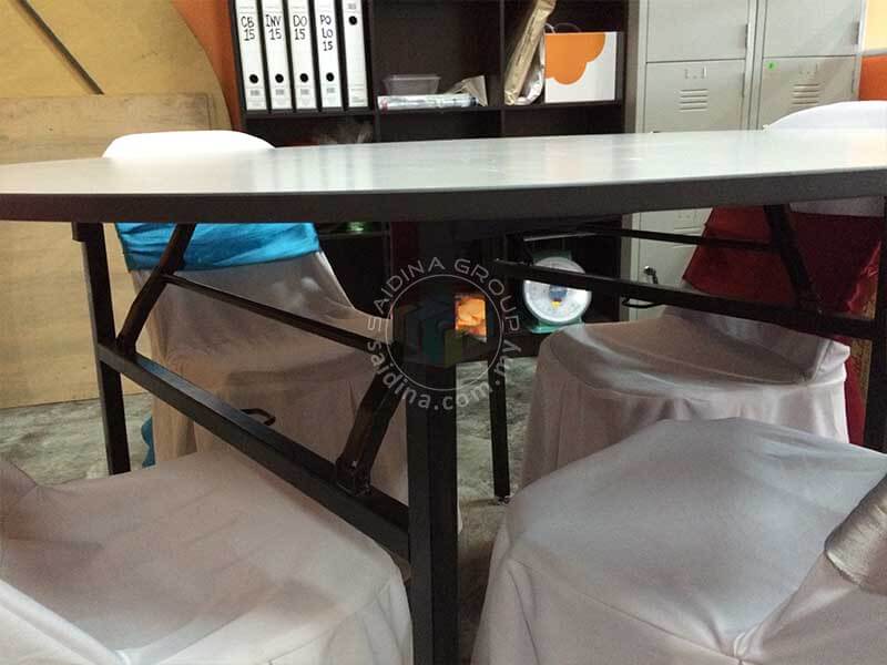 Meja Banquet Berkuaiti yang diperbuat dari Chip board di bahagian atas (top) dengan kaki besi boleh lipat.
